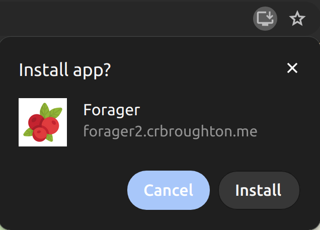 Forager is a PWA; Forager's front-end can be installed directly through your devices browser if supported. As an example, here Forager being installed through the Chrome desktop browser: